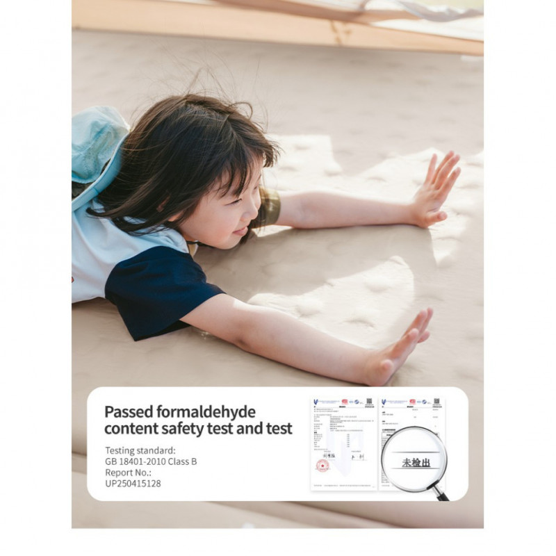 - Матеріал — 100% поліестер з PVC. Міцний та водовідштовхувальний матеріал не вбирає вологу з землі та захищає від холоду. Тканина не шарудить під час руху і безпечна для людей з чутливою шкірою, оскільки не містить формальдегіду та інших шкідливих компонентів.