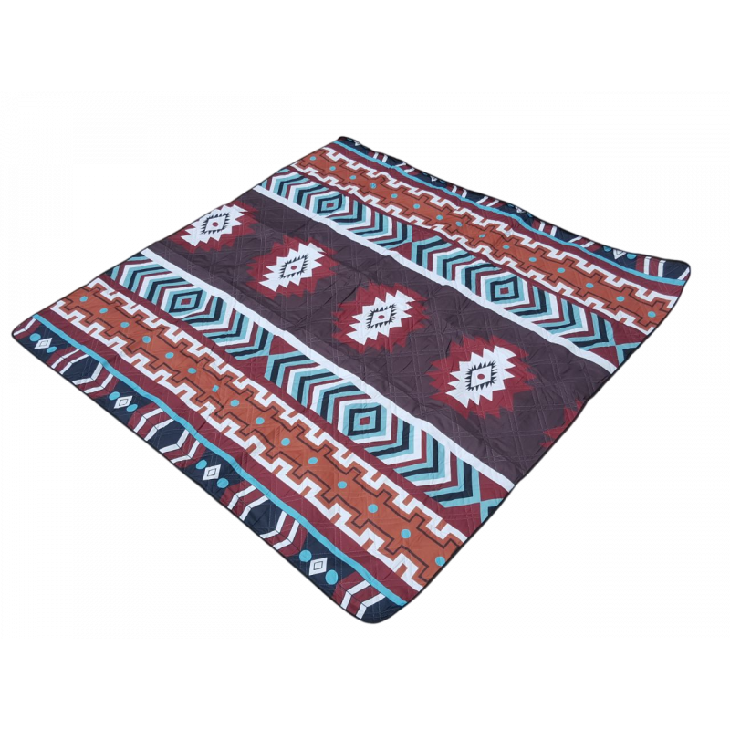 Туристичний килимок TE-202 Etno — це стильний і практичний аксесуар для пікніків, кемпінгу, пляжного відпочинку та активного проведення часу на свіжому повітрі. Завдяки розміру 200 × 200 см, він чудово підходить для всієї родини або компанії друзів. Двошарова структура з поліестер-тафти забезпечує м’якість, водонепроникність і зносостійкість. Яскравий геометричний візерунок додає оригінальності, а у складеному вигляді килимок легко транспортувати за допомогою вбудованих ручок і ремінців.Особливості Великий розмір 200 × 200 см — ідеально підходить для комфортного розміщення кількох осіб; Виготовлений із міцної поліестер-тафти — стійкий до стирання та забруднень; Двошарова конструкція товщиною 0,7 мм — приємна на дотик і добре ізолює від землі; Стильний етнічний візерунок у відтінках синього, фіолетового, бордового та блакитного кольору; Компактно скручується в рулон, фіксується ремінцями та має ручку для зручного транспортування; Вага — лише 1,1 кг, у упаковці — 1,12 кг, зручно брати з собою в подорожі або похід; Упаковка — поліетиленова плівка, що захищає виріб від пилу та вологи під час зберігання.