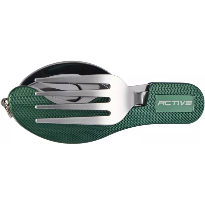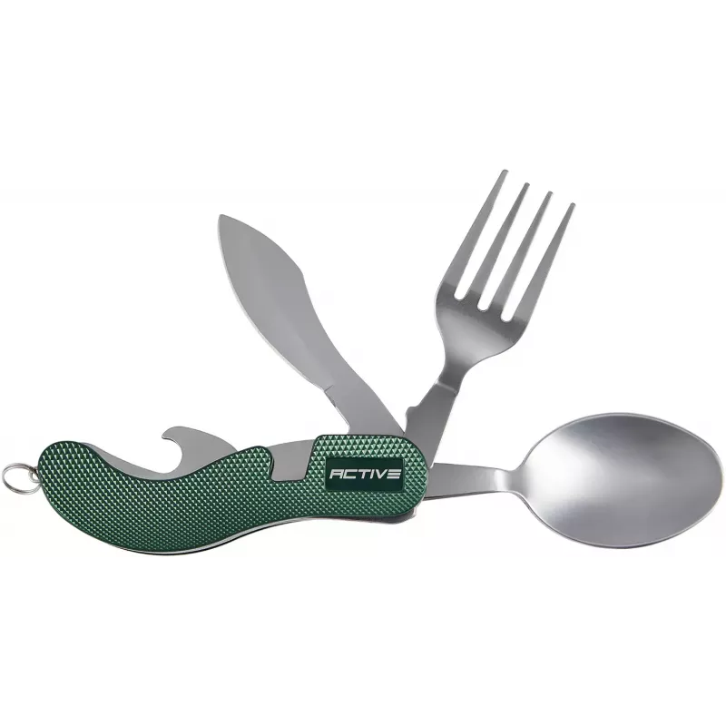 Набір складається з ложки, виделки, ножа та відкривачки, виготовлених зі сталі, руків’я виконане з текстурованого алюмінію. Всі прибори надійно з’єднуються одне з одним, щоб займати менше місця і мати змогу компактно зберігати його в похідному рюкзаку або навіть в кишені.