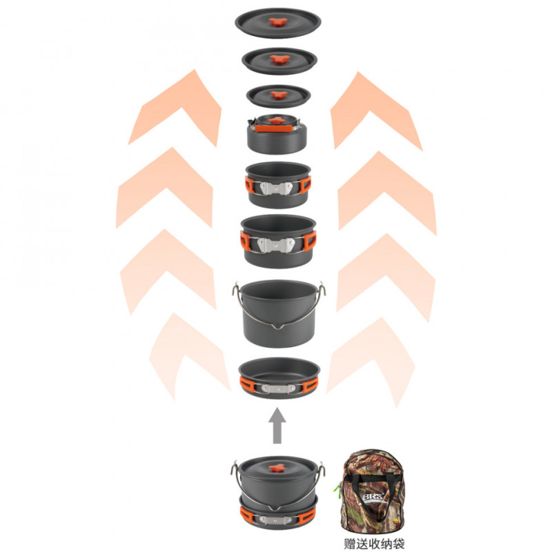 Набір посуду BRS-157 складається з розширеної кількості предметів для приготування та сервірування страв на велику групу людей. Комплект створений спеціально для походів, сімейних виїздів, кемпінгу та риболовлі, коли потрібно одночасно нагодувати користувачів першою та другою стравами, а також заварити гарячі напої.
