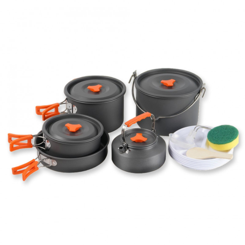 Казанок, каструлі (2 шт.), сковорідка, чайник, кришки (4 шт.), тарілки (6 шт.), ложка-лопатка, черпак, губка для миття посуду.