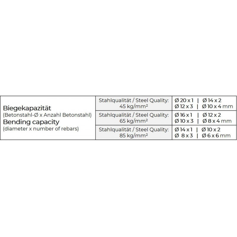 Потужність двигуна 1,5 кВт забезпечує продуктивність роботи і точне згинання різних видів металу. Конструкція верстата виготовлена з високоякісної сталі, що гарантує тривалий термін його служби. Компактні розміри дозволяють зручно та ефективно використовувати верстат в умовах обмеженого робочого простору. В стандартну комплектацію моделі входять вставки для згинання арматури різного діаметру, що значно розширює можливості обладнання.