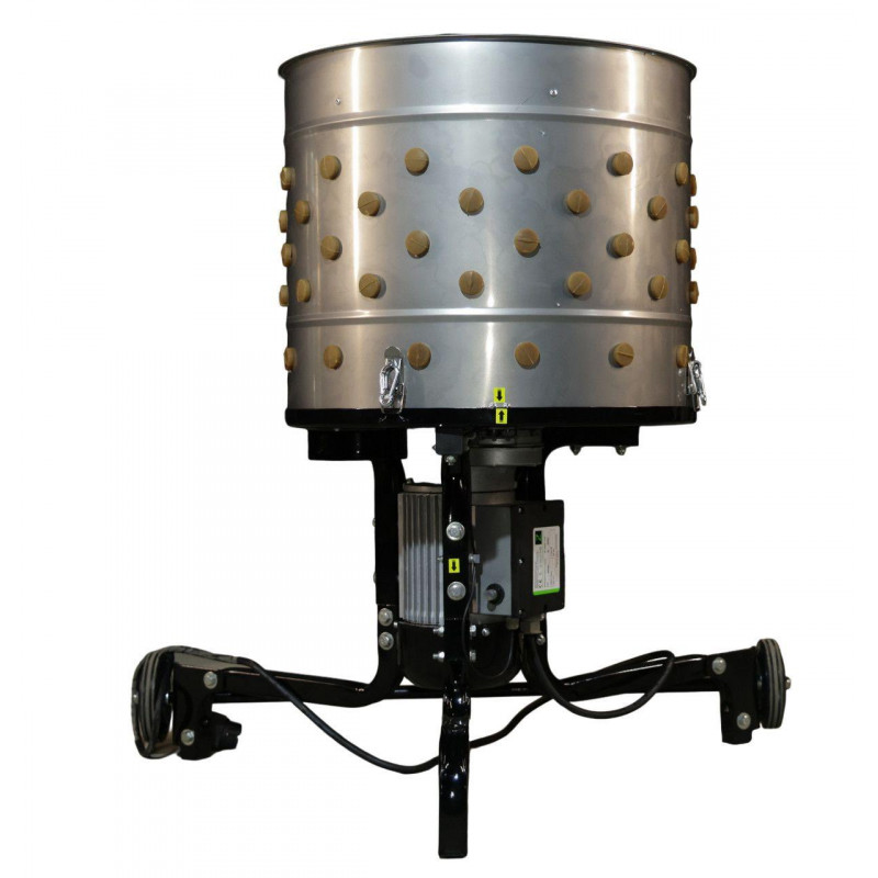 Оснащена 111 знімними гумовими пальцями для видалення пір’я та роз’ємом для підключення централізованої подачі води. Діаметр барабана 350 мм дозволяє обробляти птицю різних видів вагою до 2 кг. Двигун потужністю 1000 Вт забезпечує стабільну, продуктивну роботу, а завдяки міцним гумовим коліщатам з кульковими підшипниками пристрій можна легко переміщати.