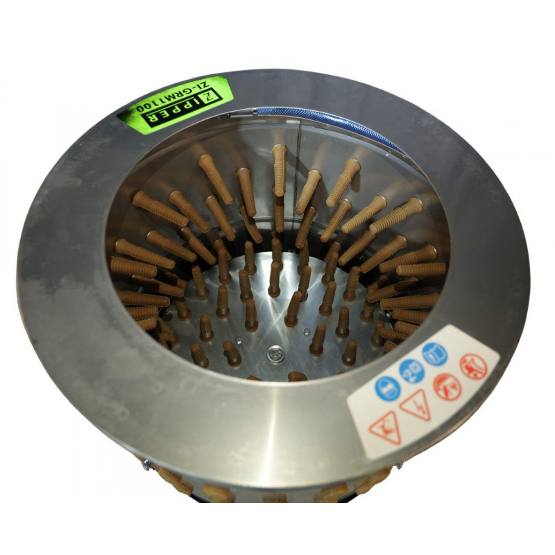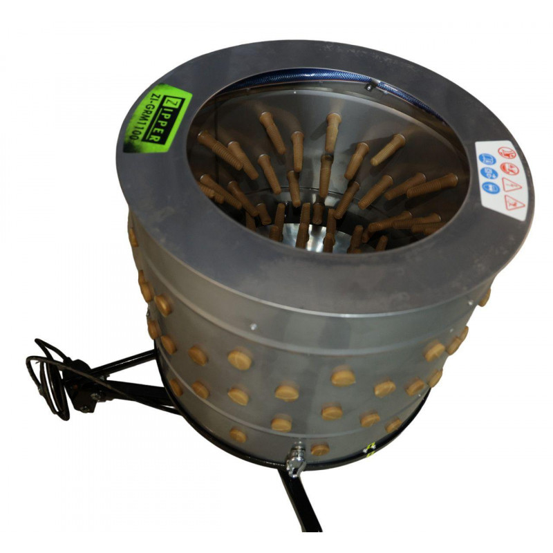 Машина для зняття пір'я Zipper ZI-GRM1100 створена для покращення та оптимізації роботи підприємств, що спеціалізуються на обробці птиці. Швидко та якісно видаляє пір’я і бруд з тушок курей, бройлерів, гусей і качок. Виготовлена зі спеціальної нержавіючої сталі для харчової промисловості, яка легко очищається і запобігає розмноженню бактерій.