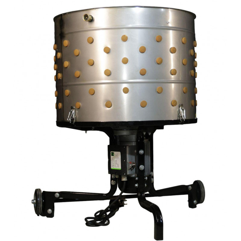 Пристрій працює на базі електродвигуна потужністю 1300 Вт з обертовою швидкістю 300 об/хв. Підключається до стандартної електромережі 230 В. Є роз’єм для підключення до централізованого водопостачання. Така машина для общипування птиці відмінно підійде для птахоферм і м’ясопереробних підприємств.