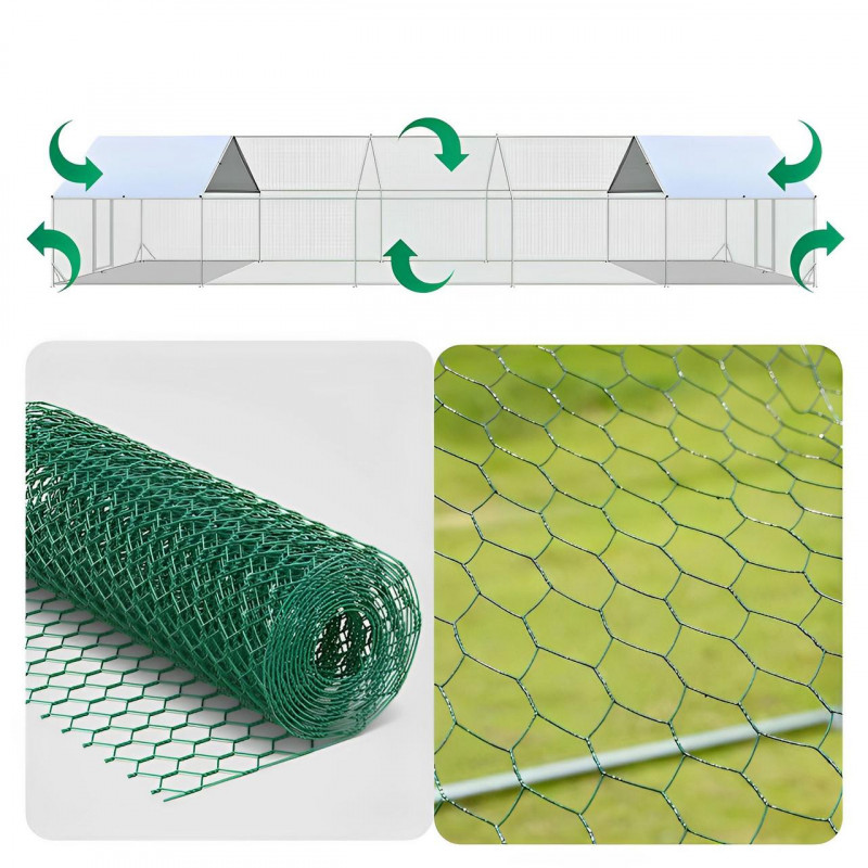 Рама виготовлена з оцинкованої сталевої труби діаметром 25 мм. Стійка до розриву, обгумована ПВХ сітка з отворами 0,9 мм надійно захищає птахів від хижаків і запобігає їх втечі. Сітка кріпиться за допомогою кабельних стяжок. Для захисту птиці від палючого сонця, дощу і граду є водонепроникне, стійке до ультрафіолетових променів накриття. Вольєр має високу стійкість за рахунок фіксаторів опор до грунту. Якщо ви шукаєте зручний і міцний вольєр для курей чи іншої домашньої птиці, ця модель задовольнить усі ваші вимоги.