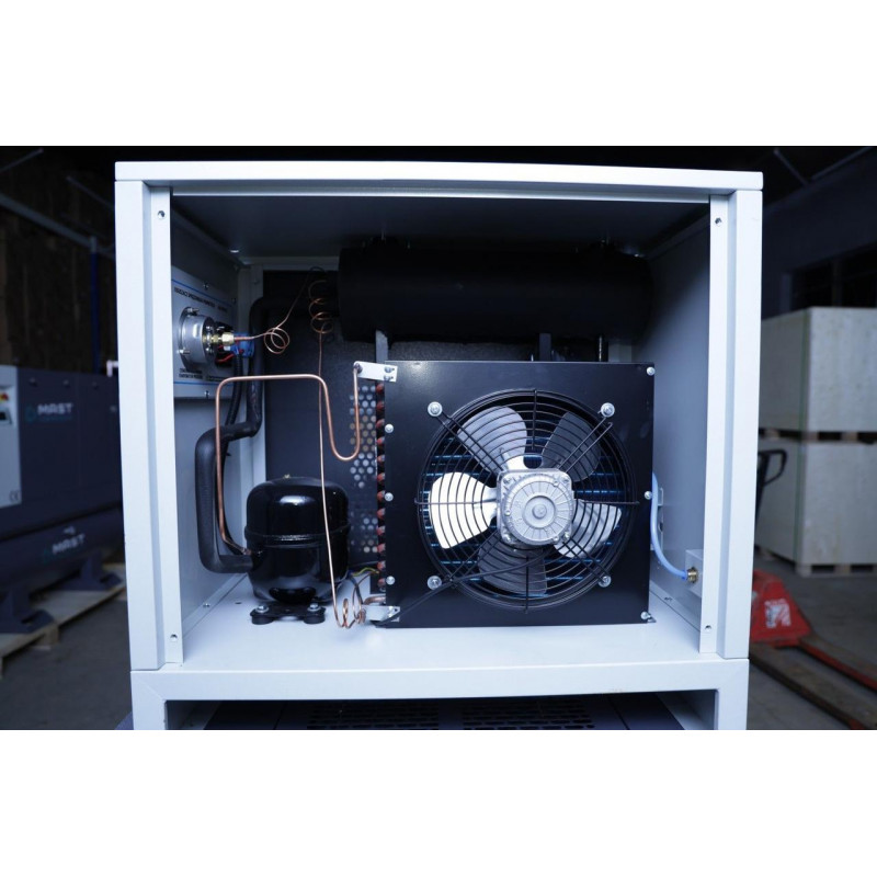 Рефрижераторний осушувач охолоджує стиснене повітря до температури, при якій волога конденсується. Після цього конденсат відводиться у спеціальну ємність, а стиснене повітря нагрівається до кімнатної температури і подається на вихід.