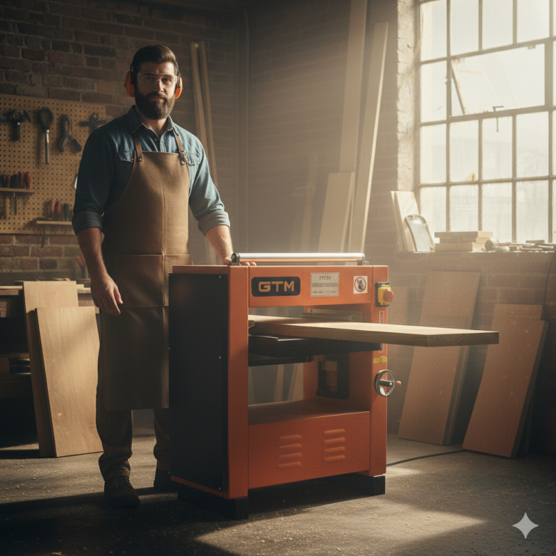 GTM TP104 - професійне обладнання для обробки деревини. Рейсмусовий верстат TP104 призначається для чистового стругання дощок під задану товщину. Знімання деревини здійснюється 4 ножами із загартованої сталі, які закріплені на обертовому валу з діаметром 77 мм. Верстат GTM TP104 здатний працювати з дошками шириною до 400 мм і товщиною від 10 мм до 120 мм. Товщина при роботі регулюється за допомогою важеля з фіксацією і мірної лінійки. Швидкість подачі заготовки сягає 13,5 м / хв. Для роботи з великогабаритними дошками є можливість під'єднати спеціальне подовження.