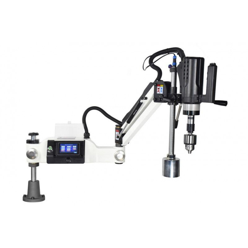 Поворотна на 0-90° різьбонарізна головка дозволяє нарізати різьбу у різних площинах і під різними кутами. Швидкозмінний патрон з фрикційною муфтою забезпечує ефективну обробку глухих і наскрізних отворів без ризику поломки інструмента. Шпиндель має правий і лівий хід. Управляється цей свердлильно-різьбонарізний маніпулятор з сенсорної панелі.