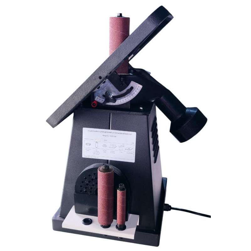 Індукційний двигун потужністю 370 Вт здійснює обертання шпинделя зі швидкістю 1400 об/хв. Вертикальний осциляційний рух шпинделя з ходом 24 мм дозволяє працювати по всій площині абразивної стрічки. Шліфувальну втулку можна легко замінити, а наявність 3 втулок різного діаметру і зернистості дає змогу якісно обробляти деталі різної форми та розміру. Міцний металевий корпус і чавунний стіл з нахилом до 45 градусів в обидві сторони підвищують точність обробки. Щоб замовити цей шліфувальний верстат по дереву, переходьте в каталог нашого сайту.