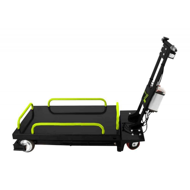 Підйом і опускання платформи здійснюється за допомогою ножичного механізму. Навантажувач рухається вперед і назад зі швидкістю до 4 км/год. Міцні поліуретанові колеса мають плавний хід і легко проїжджають по твердих поверхнях. Для надійної фіксації є електричне гальмо, яке активується перемикачем, та механічне гальмо на задніх колесах. Ручка для управління складається, що дозволяє компактно зберігати навантажувач, коли він не використовується. Такий акумуляторний ножичний підйомник буде ефективним для роботи у складах і на виробництвах, а міцна конструкція з якісних матеріалів гарантує тривалий термін служби.