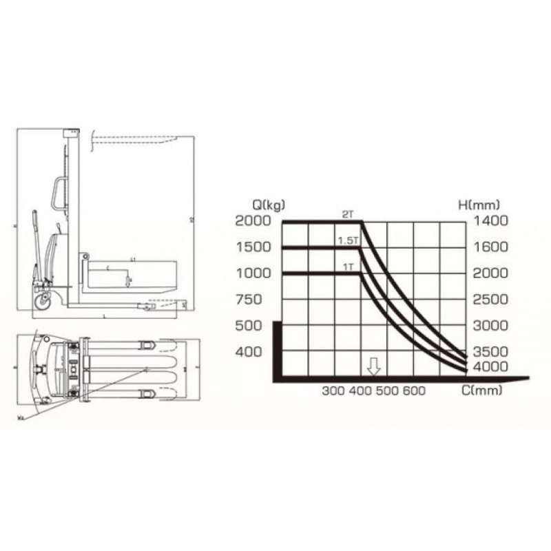Увага! перераховані показники є максимально можливими для даної моделі. Це не означає, що штабелер може піднімати максимальну вагу на максимальну висоту