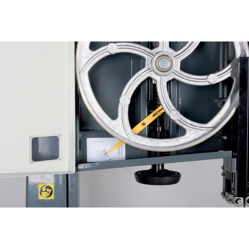 Професійна стрічкова пила по дереву з чавунними шківами і столом, трьома опорними роликами і індикатором натягу пильного полотна. Пиляльне полотно шириною 6-25 мм, довжиною 3455 мм.