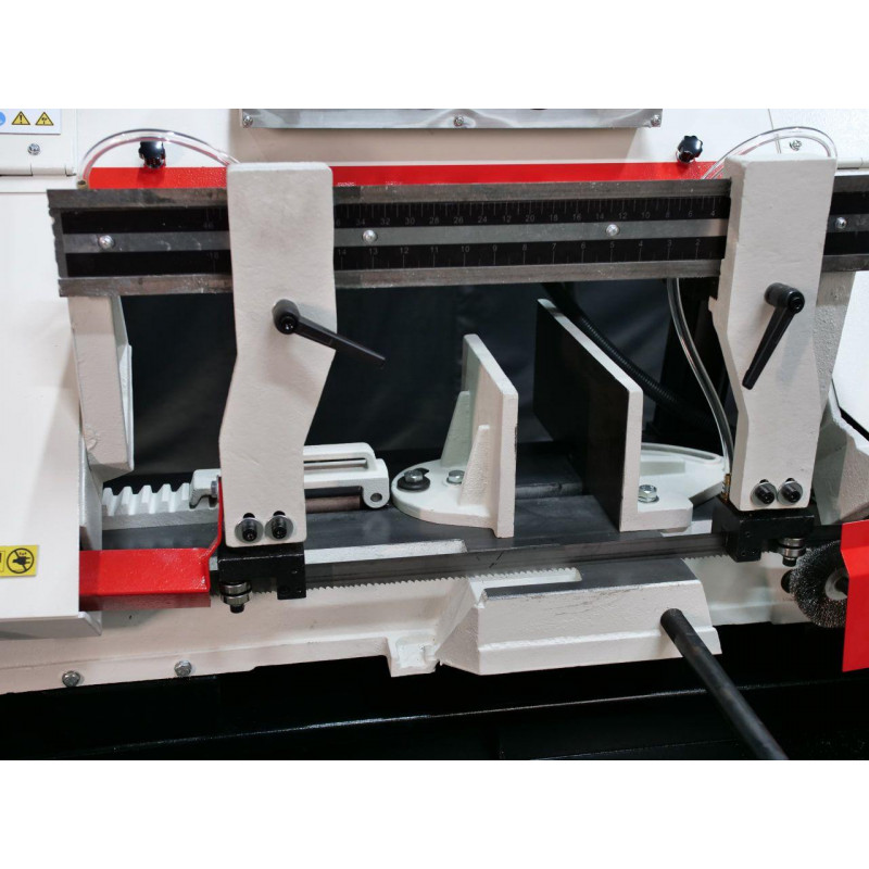 Опускання ріжучої голови здійснюється під дією сили тяжіння та обмежується гідроциліндром, що робить її рух плавним і контрольованим. Також ріжучу голову можна зафіксувати на будь-якій висоті, щоб початок опускання здійснювався безпосередньо над заготовкою. Кут різання регулюється за допомогою поворотних лещат. Завдяки ефективній системі охолодження ЗОР цей верстат стрічковий по металу може працювати на високих швидкостях без ризику перегріву, що дозволяє досягти високої продуктивності.