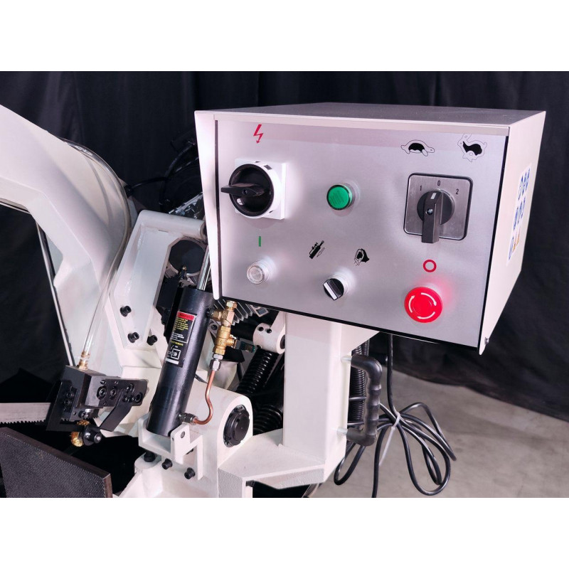 Стрічкова пила по металу MAST Metalltechnik M-BS370 400V з потужним двошвидкісним трифазним двигуном якісно та швидко виконує розпил металевих заготовок, зберігаючи високу продуктивність навіть в умовах великих навантажень. Пильне полотно висотою 27 мм забезпечує відмінну геометрію різу. Поворотна ріжуча голова дає змогу виконувати різ під кутами 45°, 60° і 90°. Рух пильної стрічки відбувається на 2 швидкостях, 34 і 68 м/хв, що дозволяє адаптувати процес різання під конкретний матеріал.