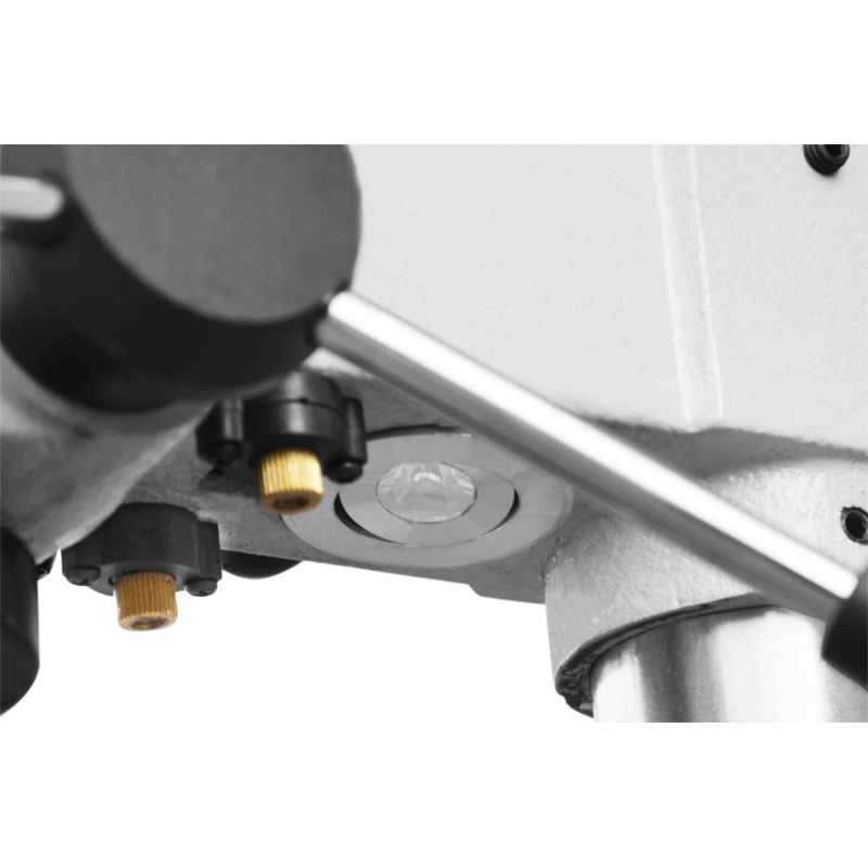 Робочий стіл регулюється по висоті і має нахил під кутом до 45° в обидві сторони, що дозволяє здійснювати широкий діапазон обробки. Швидкозатискний патрон дає змогу замінити робочий інструмент протягом кількох секунд. Для зручності роботи верстат оснащений підсвічуванням робочої зони, яке вмикається натиском кнопки. Цей верстат для свердління металу відмінно підійде для профільних майстерень і навчальних закладів, а також невеликих виробництв.