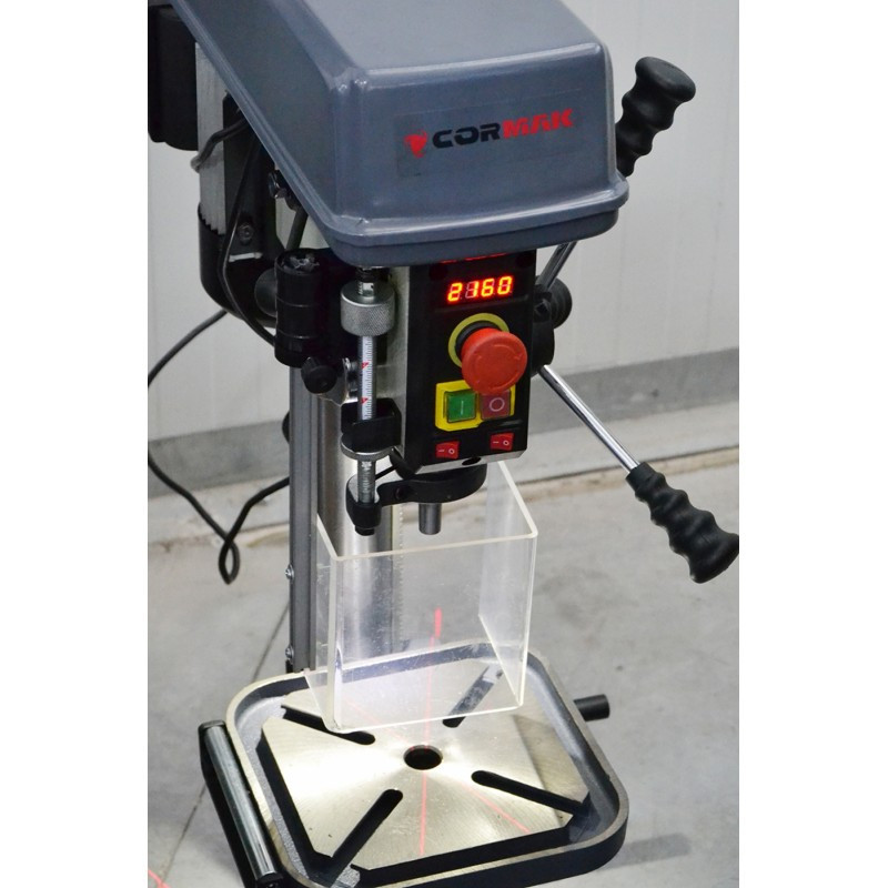 Свердлильний верстат Cormak Z7016 Vario виконує свердління у металевих деталях глухих і наскрізних отворів діаметром до 16 мм. Двигун потужністю 700 Вт (230 В) і плавне регулювання швидкості обертання шпинделя від 350 до 2700 об/хв забезпечують якісну обробку всіх видів металу. Поточна швидкість відображається на монохромному цифровому дисплеї. Для контролю робочого процесу верстат обладнаний індикатором глибини свердління.