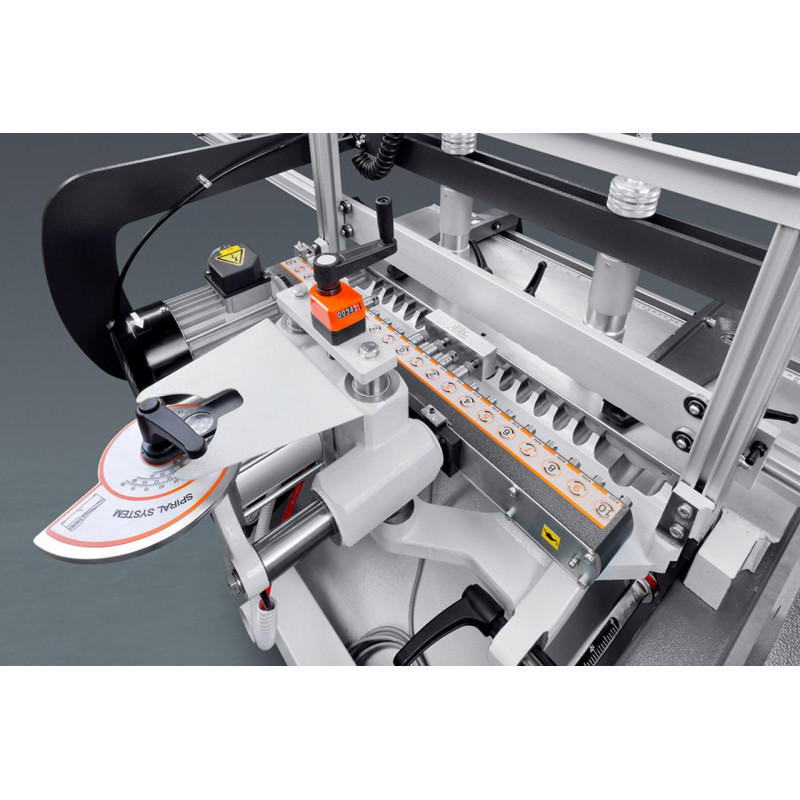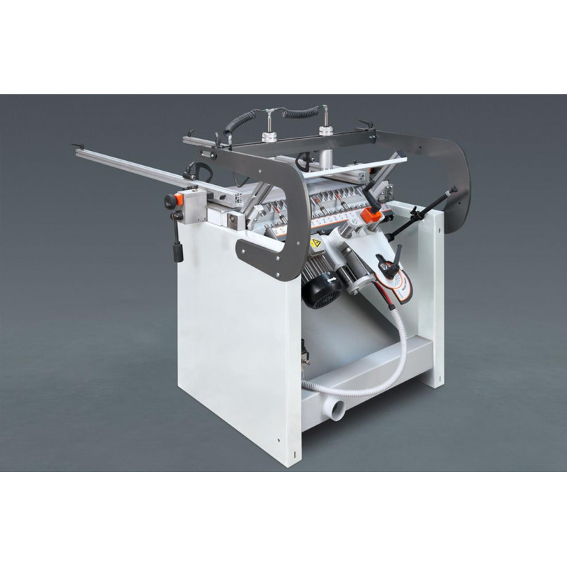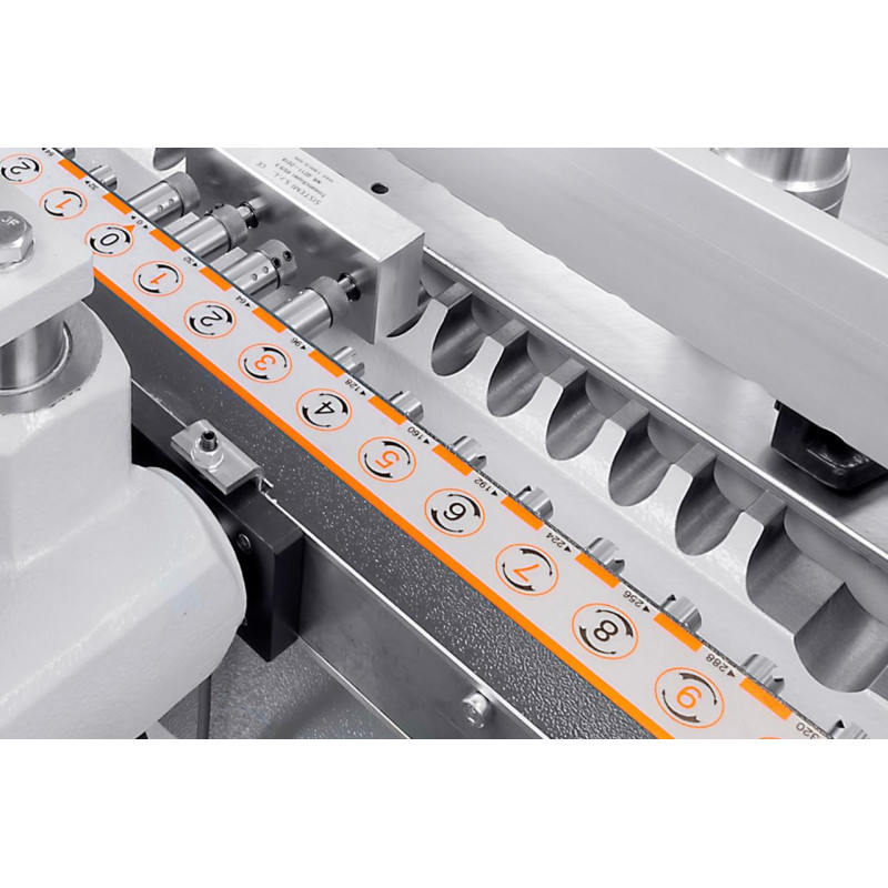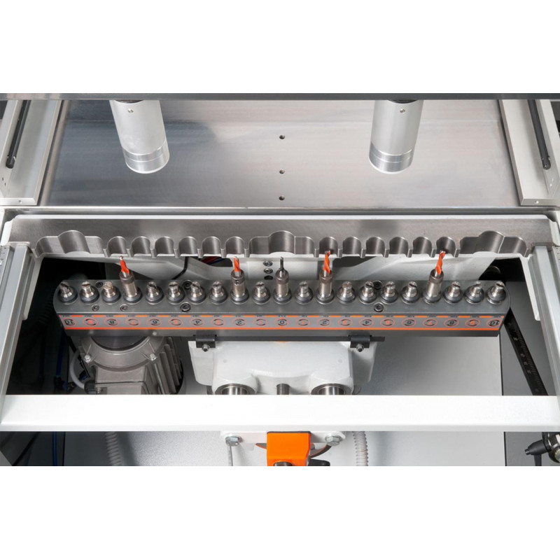 Оснащений 21 шпинделем. Свердлильний супорт має регульований кут нахилу від 0° до 90° та поперечне регулювання з цифровим індикатором. Плавне регулювання швидкості та глибини свердління забезпечує якісну обробку деталі і мінімізує ризик дефектів. Деталь позиціонується на робочому столі за допомогою позиційної лінійки і пневматичних затискачів, що забезпечує її надійну фіксацію під час обробки. Інтуїтивно зрозуміла і проста панель керування дає змогу зручно управляти процесом. Компактні розміри верстата дозволяють ефективно використовувати його на виробництвах з обмеженим робочим простором.