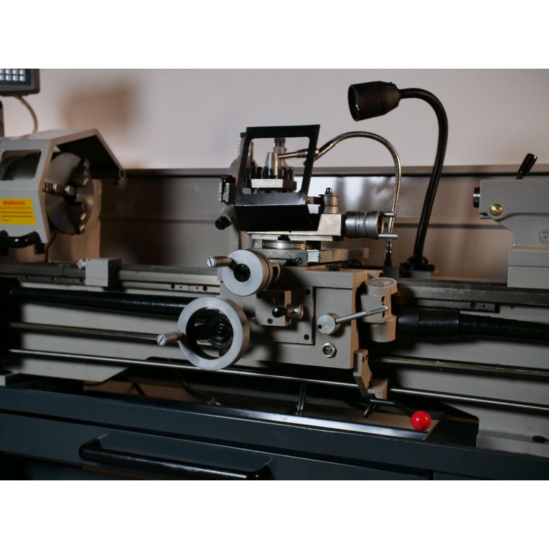 Масивна станина з індуктивно загартованими напрямними та посилена система підшипників шпинделя забезпечують точне виконання поставлених завдань. Пристрій цифрової індикації для 3 осей і 8-ступеневий редуктор із зручним перемиканням режимів роботи дають змогу ефективно обробляти різні види металів. Ще однією вагомою перевагою є можливість обробляти різьбу без необхідності заміни шестерень в гітарі.