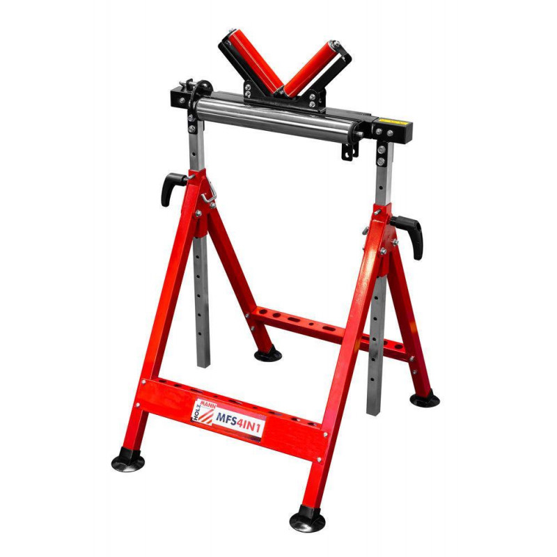 Багатофункціональна стійка Holzmann MFS 4IN1 - це корисне обладнання-трансформер для домашніх і професійних майстерень, яке виконує одразу 4 функції. Може використовуватися як роликова опора для підтримки довгих заготовок, кулькова опора для підтримки і руху заготовок у різних напрямках, V-подібна опора для круглих і профільних деталей та стаціонарна підставка для різних типів робіт. Регулювання висоти від 685 до 1100 мм дозволяє максимально налаштувати підставку під власні потреби. Висоту можна відрегулювати однією рукою.