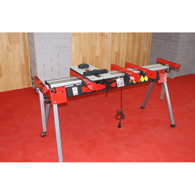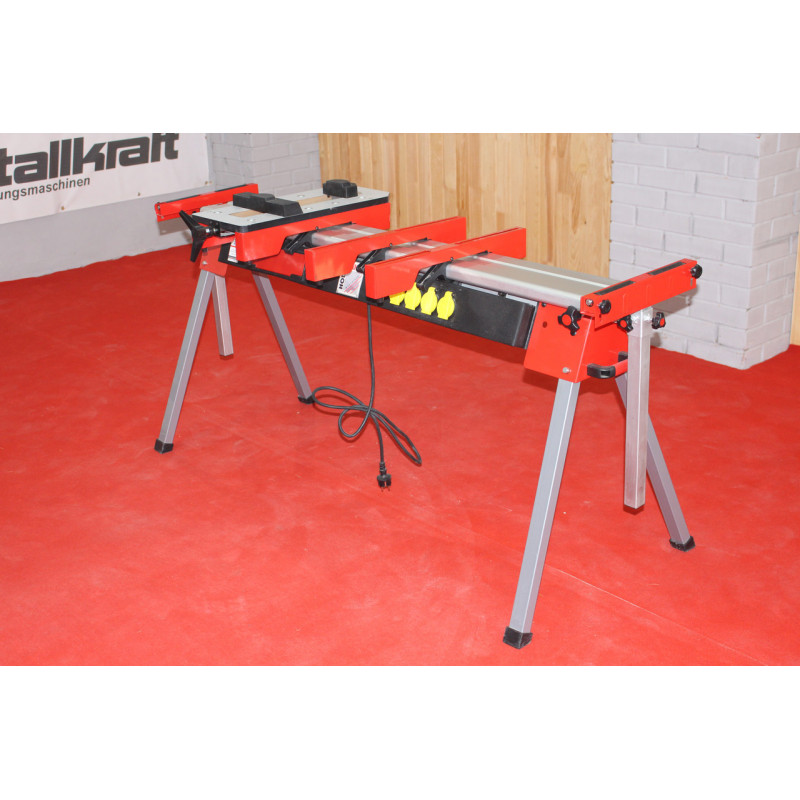Універсальна підставка для пил Holzmann USK 2760 - це зручне пристосування для роботи з ручними пилами та лобзиками, настільними свердлильними верстатами, дрилями та іншим інструментом. Регулювання довжини у діапазоні 1500-2760 мм і окреме регулювання опорних роликів по висоті дозволяють максимально адаптувати підставку під конкретне завдання. Вбудований 4-позиційний подовжувач 230 В спрощує підключення електроінструменту. Для кріплення обладнання використовуються 2 рейки, які можна переміщати по підставці.