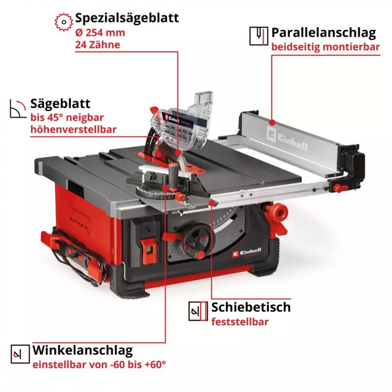 Професійна циркулярна пила Einhell TP-CC 10 T є обов'язковим елементом для кожної майстерні завдяки своїй потужності 2000 Вт, пильному диску діаметром Ø 254 мм та рухомій каретці. Пильний диск може нахилятися до 45° та регулюється по висоті. Паралельний упор може бути встановлений з будь-якого боку та має відкидну систему, яка дозволяє йому функціонувати як розширення столу. Альтернативно, його можна закріпити безпосередньо поруч з пильним диском для виконання вузьких пропилів. Алюмінієвий кутовий упор оснащений напрямною сіткою з кроком 15° та може бути прикріплений до рухомого столу. Сталева рамна конструкція забезпечує стійкість, а ручки для транспортування та тримачі для аксесуарів полегшують переміщення.