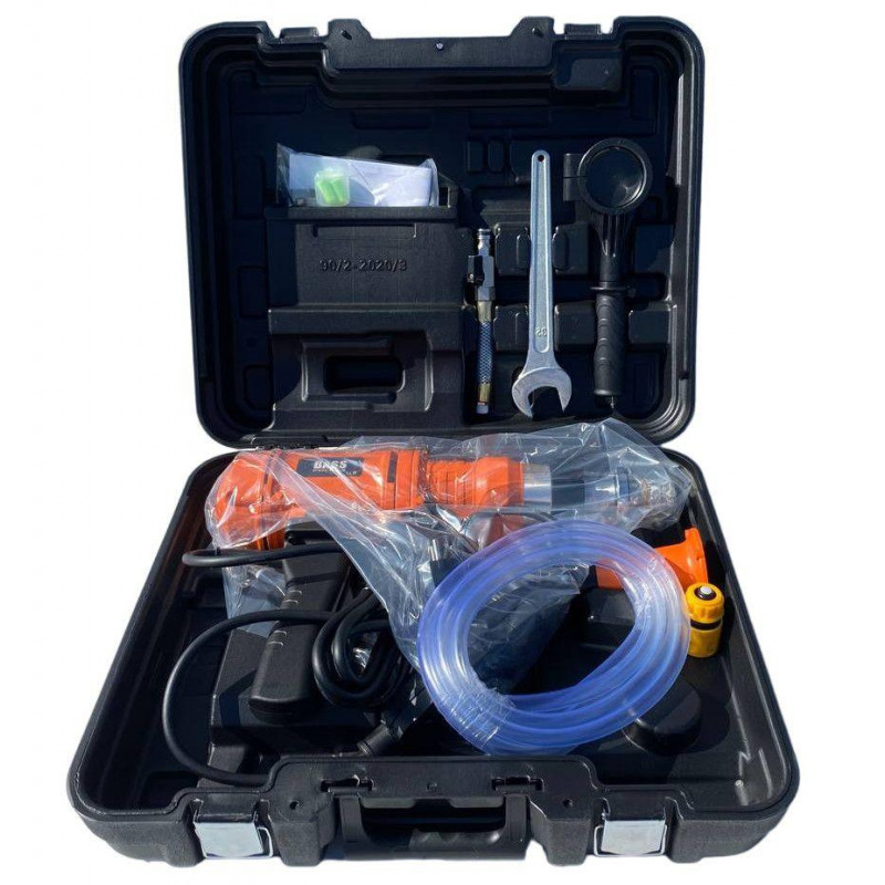 Установка алмазного буріння по бетону Bass Polska 7751 - це потужний професійний інструмент для сухого і мокрого свердління отворів у залізобетоні, штучному і натуральному камені, цеглі та вогнетривких матеріалах. Має 3 швидкості обертання, що дозволяє встановити оптимальні параметри для різних матеріалів і розміру отворів. Максимальний діаметр свердління бетону - 76 мм, цегли - 105 мм.
