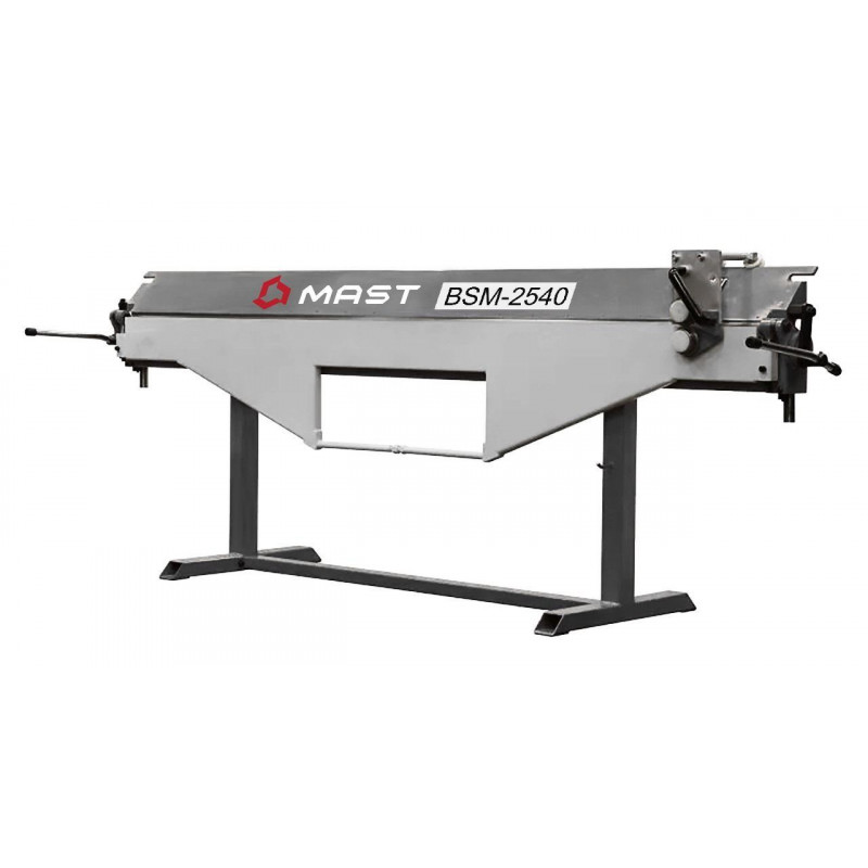 Ручний листозгинальний верстат з ріжучим ножем MAST BSM-2540 - це інструмент з ручним керуванням який має жорстку зварену конструкцію. Також присутні ексцентриковий механізм і напрямляючий вертикальний вузол переміщення притискної балки, суцільний сталевий куточок з гострою геометріює для отримання на заготовках малий R при згинанні, згинальна балка має вузол налаштування прямолінійності. Верстат ідеально підходить для роботи з чорною та оцинкованою сталлю. Верстат MAST BSM-2540 є універсальним для роботи з відливами, відкосами, додатковими елементами покрівлі, в тому числі і для роботи з великогабаритними виробами - такими як квадратна вентиляція (загальні габаритні розміри верхньої притискної балки становлять 170х170 мм). Можливість згинання від 0° до 135° – за один згин, згинання до 180° – з дотисканням у притискній балці.