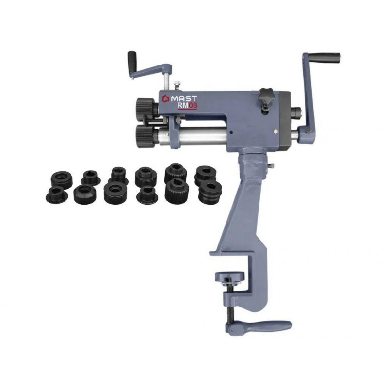 Зигувальний верстат MAST Metalltechnik RM 08 - це компактне, портативне обладнання для створення ребер жорсткості, формування бортів і фальцевих з'єднань на листовому металі товщиною до 0,8 мм. Комплектується шістьма наборами змінних роликів різного профілю, що дає змогу виконувати різнотипні операції.