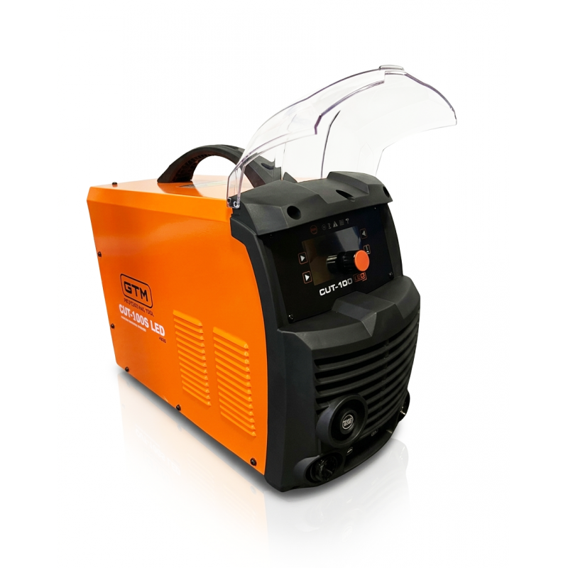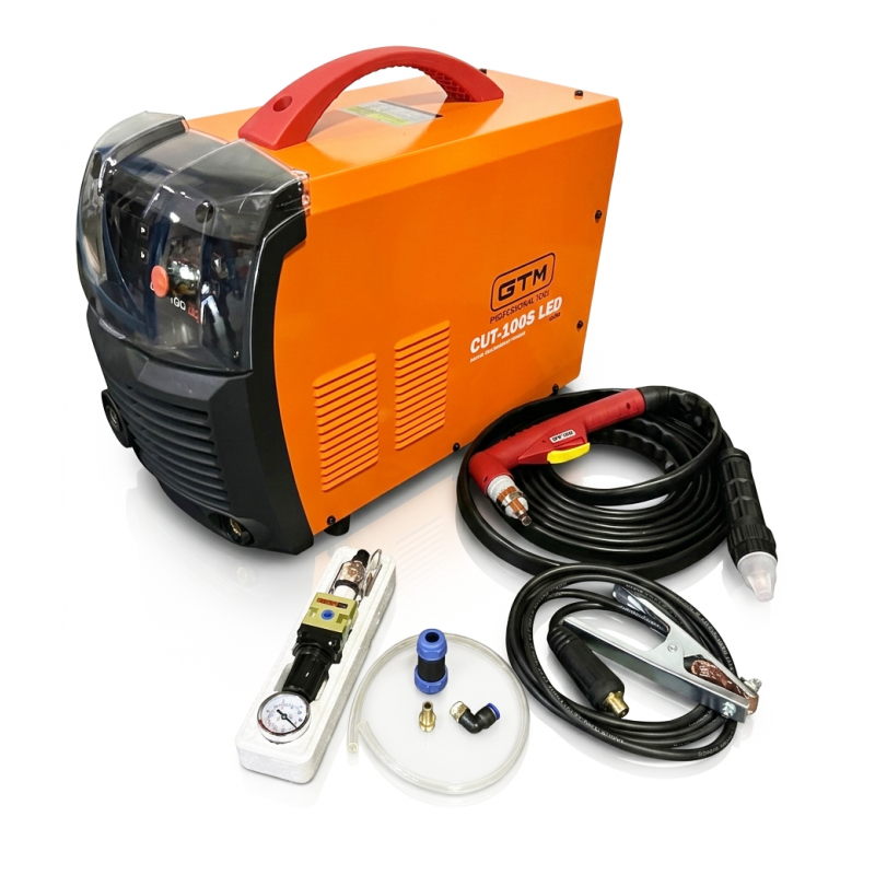 GTM CUT-100 - апарат плазменої різки металу, застосовується для різки чорних, нержавіючих, кольорових металів та чавуну. Стиснене повітря, що використовується для різки, є цілком безпечним на відміну від газо-кисневого різання. Плазморіз працює лише спільно з компресором (рекомендована продуктивність від 250 л/хв., тиск 0.45-0.65 МПа).