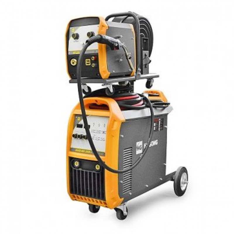 Промисловий зварювальний напівавтомат MIG / MAG з виносним механізмом, що подає для зварювання вуглецевих, низьколегованих, нержавіючих сталей c розширеним набором налаштувань і синергетичним управлінням, а також можливістю зварювання покритим електродом ММА на постійному струмі.