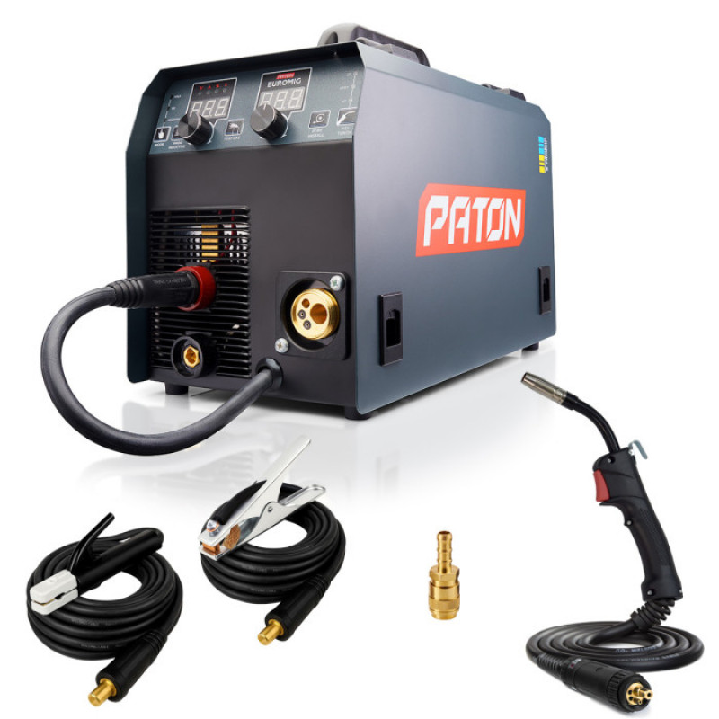Цифровий інверторний напівавтомат PATON EuroMIG – це апарат однокорпусного типу виконання, призначений для напівавтоматичного зварювання (НА «MIG/MAG»), ручного дугового зварювання (РДС «MMA»), аргонодугового зварювання (АРГ «TIG») і постійним струмом в середовищі захисних газів і сумішей. В апараті EuroMIG реалізований повністю цифровий спосіб управління, за рахунок чого забезпечуються його багатофункціональність і широкі можливості в точному налаштуванні режимів зварювання. Номінальний струм до 150А дає можливість працювати будь-якими електродами діаметром від 1,6 мм до 4 мм і суцільним зварювальним дротом діаметром від 0,6 мм до 1,0 мм. Окремий закритий відсік для зварювального дроту підвищує його захист від пилу та інших забруднень.