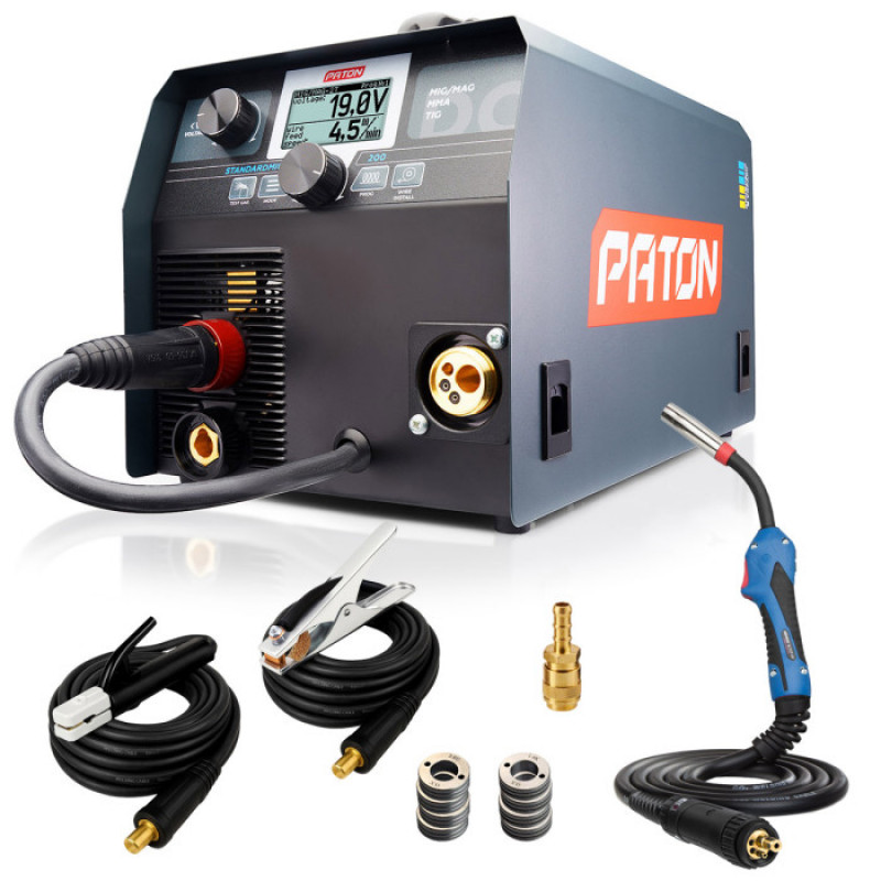 Цифровий інверторний напівавтомат PATON StandardMIG-200 – це апарат однокорпусного типу виконання, призначений для напівавтоматичного зварювання (НА «MIG/MAG»), ручного дугового зварювання (РДС «MMA»), аргонодугового зварювання (АРГ «TIG») постійним струмом в середовищі захисних газів і сумішей. В апараті StandardMIG-200 реалізований повністю цифровий спосіб управління, за рахунок чого забезпечуються його багатофункціональність і широкі можливості в точному налаштуванні режимів зварювання. Номінальний струм до 200А дає можливість працювати будь-якими електродами діаметром від 1,6 мм до 4 мм і суцільним зварювальним дротом діаметром від 0,6 мм до 1,0 мм. Окремий закритий відсік для зварювального дроту підвищує його захист від пилу та інших забруднень.